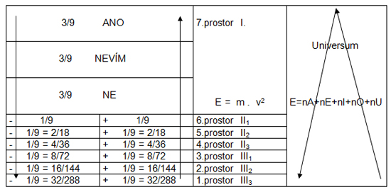 (K) Myslím, že nyní jsme schopni se vrátit ke konstrukci rovnice Universa. Tvrdím, že Universum je stavová a pohybová matice rovnic v prostoru a čase. Energie, jak víme, tvoří prostor a čas svým BYTÍM. Teprve následně je Universum i prostorovou a časovou maticí rovnic. Využijme obecně platnou energetickou rovnici Einsteina. A to z důvodů, jež jsem uvedl v minulém díle, že Einstein se zabýval energií (1) pohybující se v éteru (0). Rovnice E= m. c2 je obecně platná pro energii pohybující se prostorem.