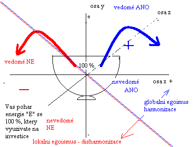 Prostor resp. plochu našeho BYTÍ lze rozdělit symbolicky na 2 poloprostory, ( poloroviny, polopřímky ). Jeden prostor, označme ho modré (+) resp. polopřímek s kladnými hodnotami. Budeme-li investovat v tomto směru budeme prosazovat nejen svou lokální harmonii, ale i globální harmonii resp. vyšších energetických nadsystémů. Bude-li investice směřována do druhého poloprostoru, (poloroviny, polopřímky ), označené červené (-) resp. do polopřímek se zápornými hodnotami půjde o investici pouze do lokální harmonie resp. globální disharmonie. Záleží na svobodné vůli každého z nás. My jsme rozhodující se bytosti jako každý jiný archetyp a bytost v Universu a ze svého stavu poznání svobodně rozhoduje o svém budoucím stavu BYTÍ a o směru a velikosti naší investice energie do budoucího pohybu. Jsme omezováni jen svým poznáním a „osudovým „ prostředím, do kterého nás zavedly naše dřívější rozhodnutí. Ty najdeme každý ve svém archivu HH a JJ těl.